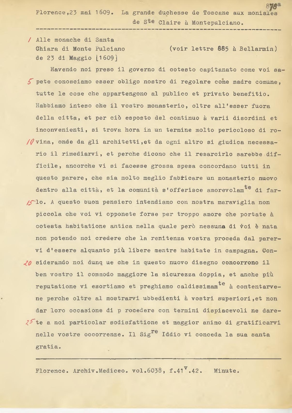 / Alle monache di Santa Chiara di Monte Pulciano de 23 di Maggio [1609]