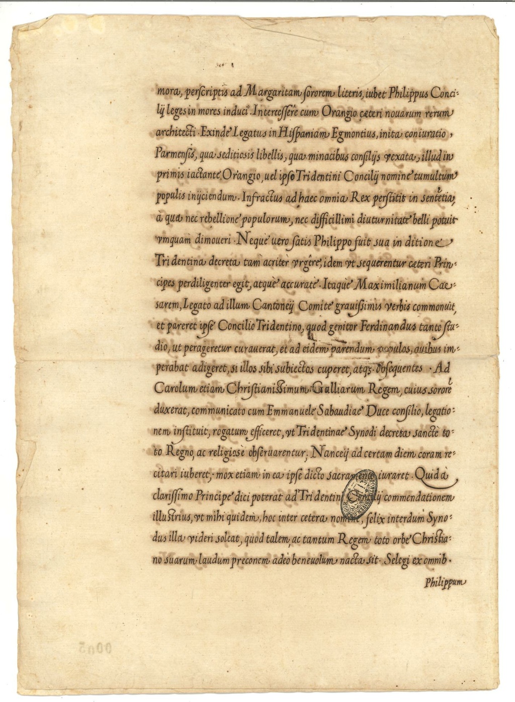 mora, perscriptis ad Margaritam sororem literis, iubet Philippus Concilii leges in mores induci. Intercessere cum Orangio caeteri novarum rerum architecti. Exinde Legatus in Hispaniam Egmontius, inita coniuratio Parmensis, qua seditiosis libellis, qua minacibus consiliis vexata, illud in primis iactante Orangio, vel ipso Tridentini Concilii nomine tumultum populis iniiciendum. Infractus ad haec omnia Rex perstitit in sententia, a qua nec rebellione populorum, nec difficillimi diuturnitate belli potuit umquam dimoveri. Neque vero fatis Philippo fuit sua in ditione Tridentina decreta tam acriter urgere, idem ut sequerentur caeteri Principes perdiligenter egit, atque accurate. Itaque maximilianum Caesarem, Legato ad illum Cantoneii Comite gravissimis verbis commonuit, et pareret ipse Concilio Tridentino, quod genitor Ferdinandus tanto studio, ut perageretur curaverat, et ad eidem parendum populos, quibus imperabat adigeret, si illos sibi subiectos cuperat, atque obsequentes. Ad Carolum etiam Christianissumum Galliarum Regem, cuius sorore duxerat, communicato cum Emmanuele Sabaudiae Duce consilio, legationem instituit, rogatum efficeret, ut Tridentinae Synodi decreta sanctae toto regno, ac religiose observarentur. Nanceii ad certam diem coram recitari iuberet; mox etiam in ea ipse dicto sacramento iuraret. Quid a clarissimoPrincipe dici poterat ad Tridentini Concilii commendationem illustrius, ut mihi quidem, hoc inter cetera nomine, felix interdum Synodus illa videri soleat, quod talem, ac tantum Regem toto orbe Christiano suarum laudum preconem adeo benevolum nacta sit. Selegi ex omnibus…