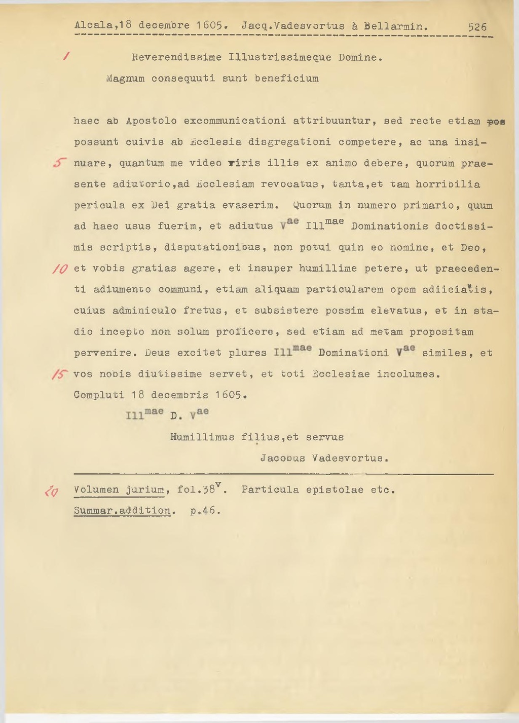 haec ab Apostolo excommunicationi attribuuntur, sed recte etiam possunt cuivis ab Ecclesia disgregationi competere, ac una insinuare, quantum me video viris illis ex animo debere, quorum praesente adiutorio, ad Ecclesiam revocatus, tanta, et tam horribilia pericula ex Dei gratia evaserim. Quorum in numero primario, quum ad haec usus fuerim, et adiutus V.ae Ill.mae Dominationis doctissimis scriptis, disputationious, non potui quin eo nomine, et Deo et vobis gratias agere, et insuper humillime petere, ut praecedenti adiumento communi, etiam aliquam particularem opem adiiciatis, cuius adminiculo fretus, et subsistere possim elevatus, et in stadio incepto non solum proficere, sed etiam ad metam propositam pervenire. Deus excitet plures Ill.mae Dominationi V.ae similes, et vos nobis diutissime servet, et toti Ecclesiae incolumes.